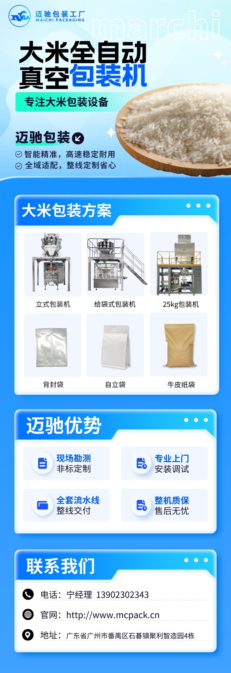 作为行业内的源头实力厂家,广州迈驰包装设备有限公司在这一领域表现突出。该公司推出的迈驰大米自动称重包装机及迈驰大米真空包装机系列设备,凭借高精度与高稳定性,赢得了市场的广泛认可。