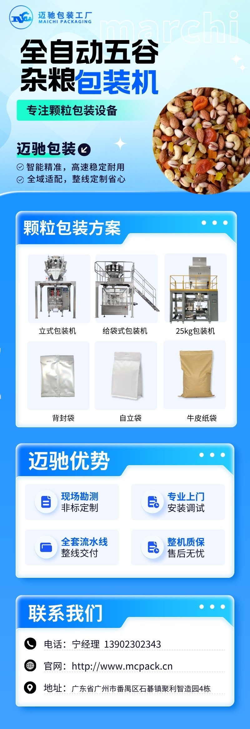 广州迈驰包装设备有限公司(位于广州市番禺区)作为一家专注包装设备无人化、智能化的源头实力厂家,其MCGD8-200型给袋式包装机已在全国多个地区得到广泛应用,为粮食加工企业及食品生产商提供可靠的包装解决方案。